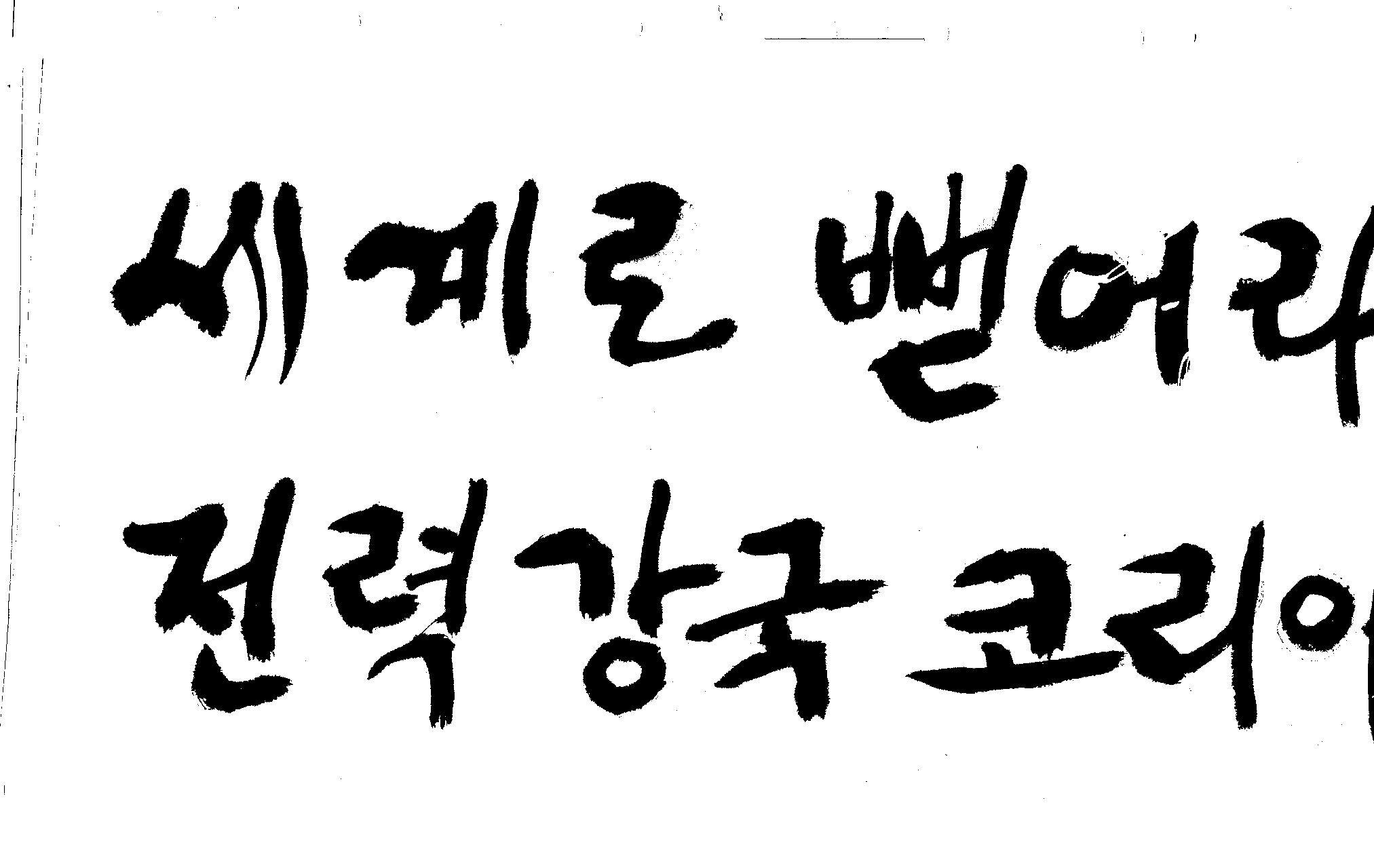 캘리 좀 부탁드려요!~ 김철호 일반 1 12742 2008.12.24 12:09 > > > > > > > > > 전력회사 신문광고를 하는데요 캘리로 멋지게 하고픈데 > > > 캘리프로그램으로 아무리 써도 느낌이 안나옵니다 ㅜ.ㅜ > > > 이런걸 부탁한다는 자체가 너무나도 염치없지만 부탁드립니다. > > > > > > 세계로 뻗어라! 전력강국 코리아 > > > > > 보기는 쉬워도 하기는 어려운게 > > 세상 모든 일 일겁니다. > > 그중에 캘리그라피가 그런 것일 겁니다... > > 스캔중에 글꼴이 잘린것은 서로다른글꼴서 편집하시길... > > 글수가 많아서 어쩔 수없네요... > > >