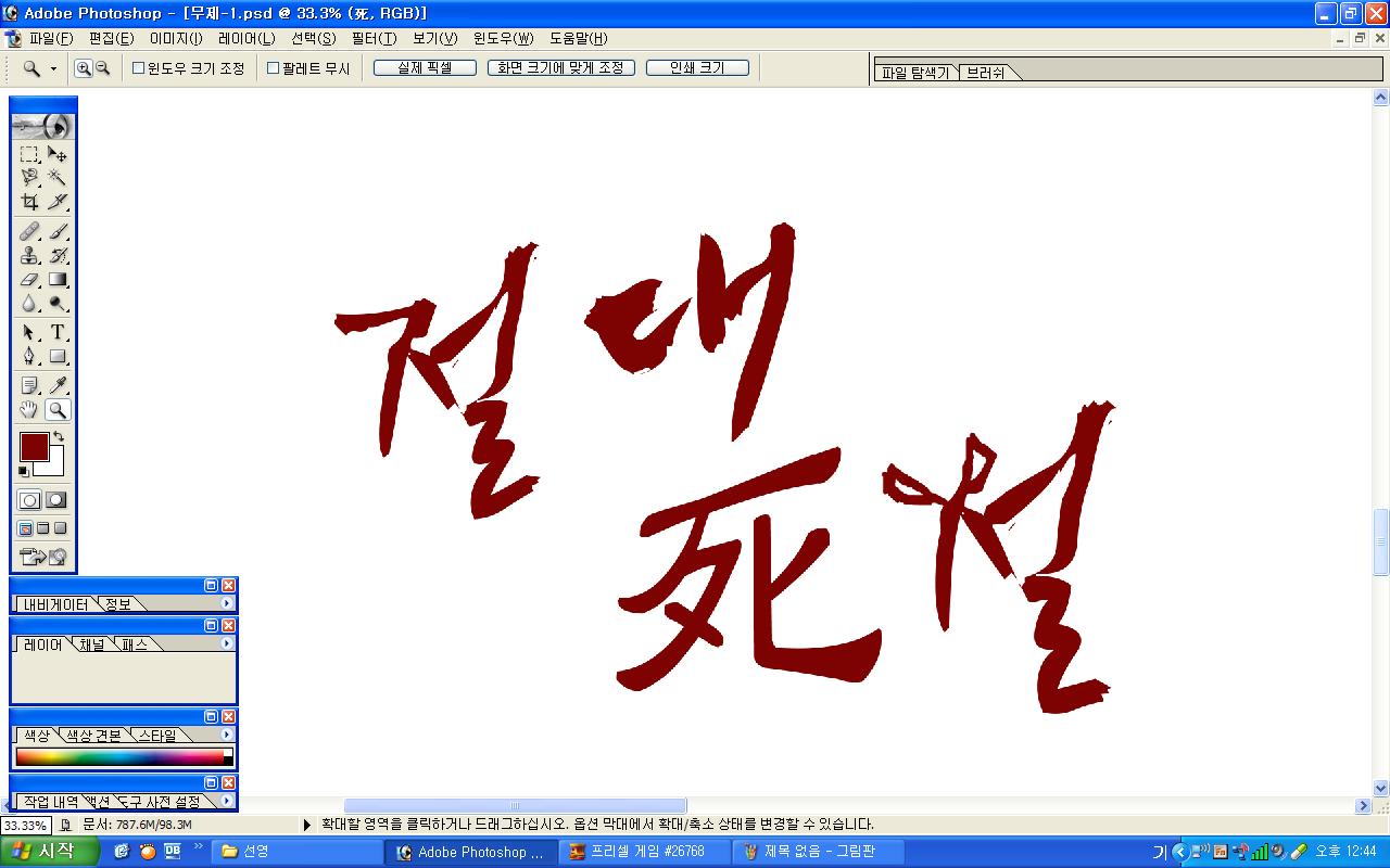 정중히 캘리 부탁드립니다. -_- 류재철 일반 0 5763 2009.11.16 11:18 실력자 분들이 많이 계셔서 이렇게 염치없게 부탁드립니다. - 절대死절 : 첨부한 파일 참고해주시면 감사하겠습니다.(약간 거친느낌? ^^;;) : '절'자의 ㅈ은 가위로...^^;; : 포스터 제작용이라 ai 파일이 필요합니다. 대학동아리 연극공연 포스터로 쓸 예정입니다. 비상업적인 공연이라 이렇게 부탁드립니다.